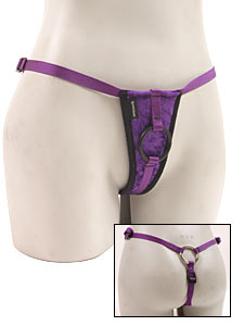 Description: A skimpy thong harness for hot tropical nights. Brazilian bikini straps accentuate your best features. Purple velvety material is sensuous to the touch. 3-way adjustable nylon straps fir up to 44 inch hips.