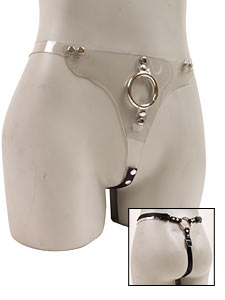 Description: It’s like wearing nothing at all! Unveil your private mysteries. Made of clear vinyl, it’s soft, yet durable. Metal O-ring holds an assortment of dongs. 3-way adjustable straps fit up to 52 inch hips.