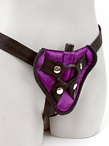Purple Velvet Vibrating Harness Description: Comfortable, secure, adjustable & accommodates any toy with flared base. Includes 1 multi-speed vibrator for clitoral stimulation w/3 batteries & 3 Silicone O-rings (2 inches, 1¾ inches, 1½ inches). 4 point adjustable harness (2 on waist, 1per leg) fits up to 60 inch hips.